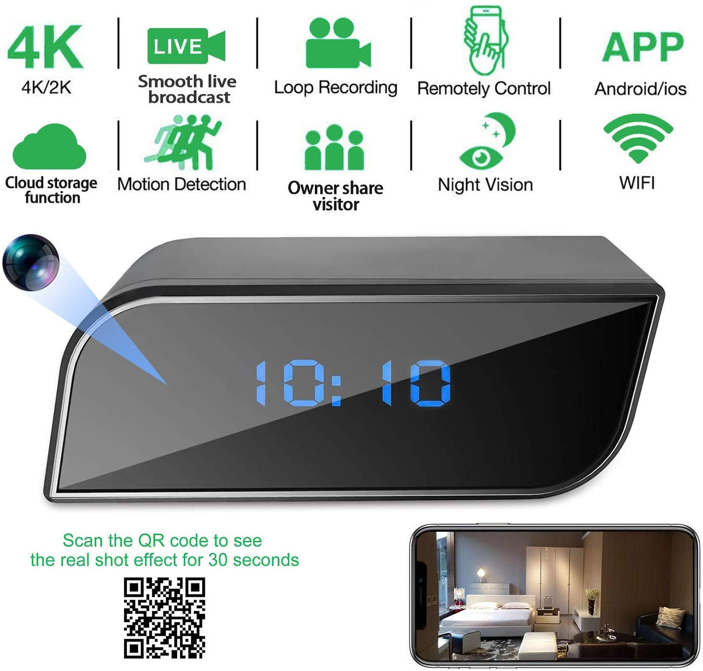 • 3. [Ultra HD 4K Clock Hidden Camera] is one of the few cameras in 4K cameras. The video uses H.264 encoding, which saves more than 2 times the storage capacity compared to the conventional coded HD on the market. The camera is equipped with a charger and data cable that can be used directly after receipt. If you want to install the battery, you need to purchase it separately, the specification is 18650 3.7-5V, it supports both power modes, and supports charging when recording.