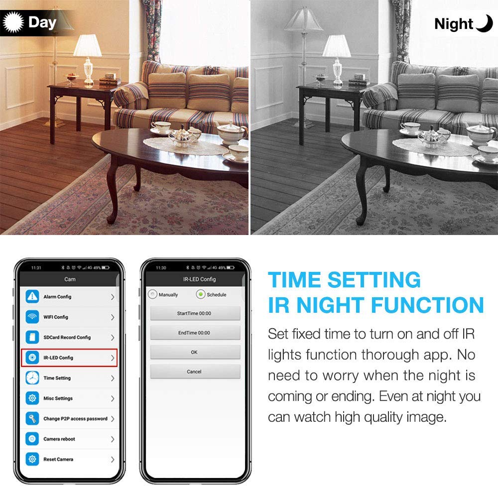 • 4. [No light night vision, self-heating point]: There are 9 "940nm" infrared lights, the human eye can't see its light. For other companies, there are only 5 night vision lights. The camera's self-hotspot is used for mobile phone connections. You can also configure the camera with a 2.4GHz WiFi network (not supporting 5G WiFi) for remote control, regardless of distance, and can be used.